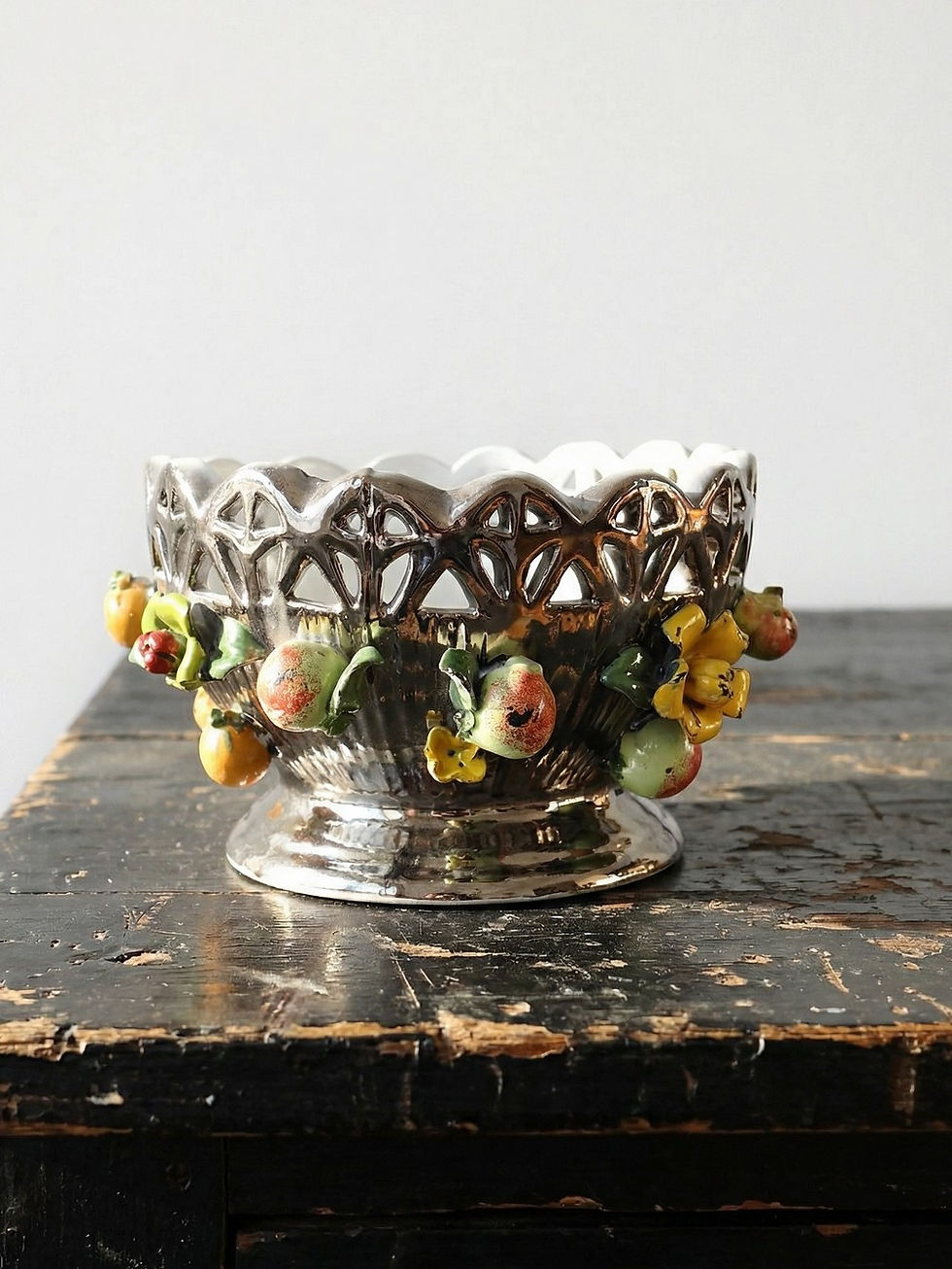 Coupe italienne vintage en porcelaine argentée ajourée fruits et fleurs